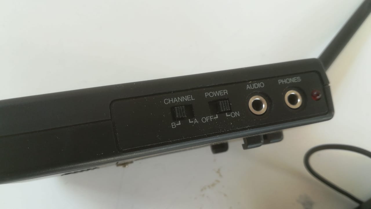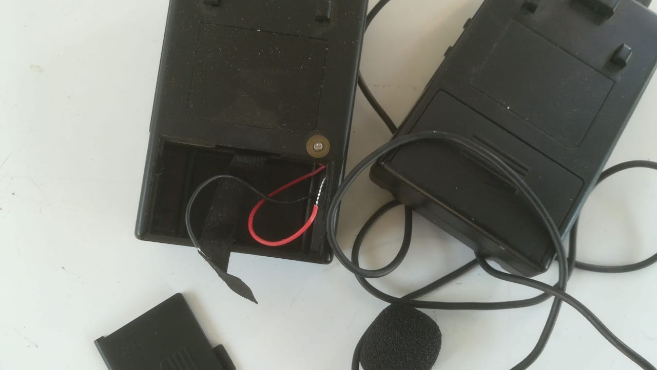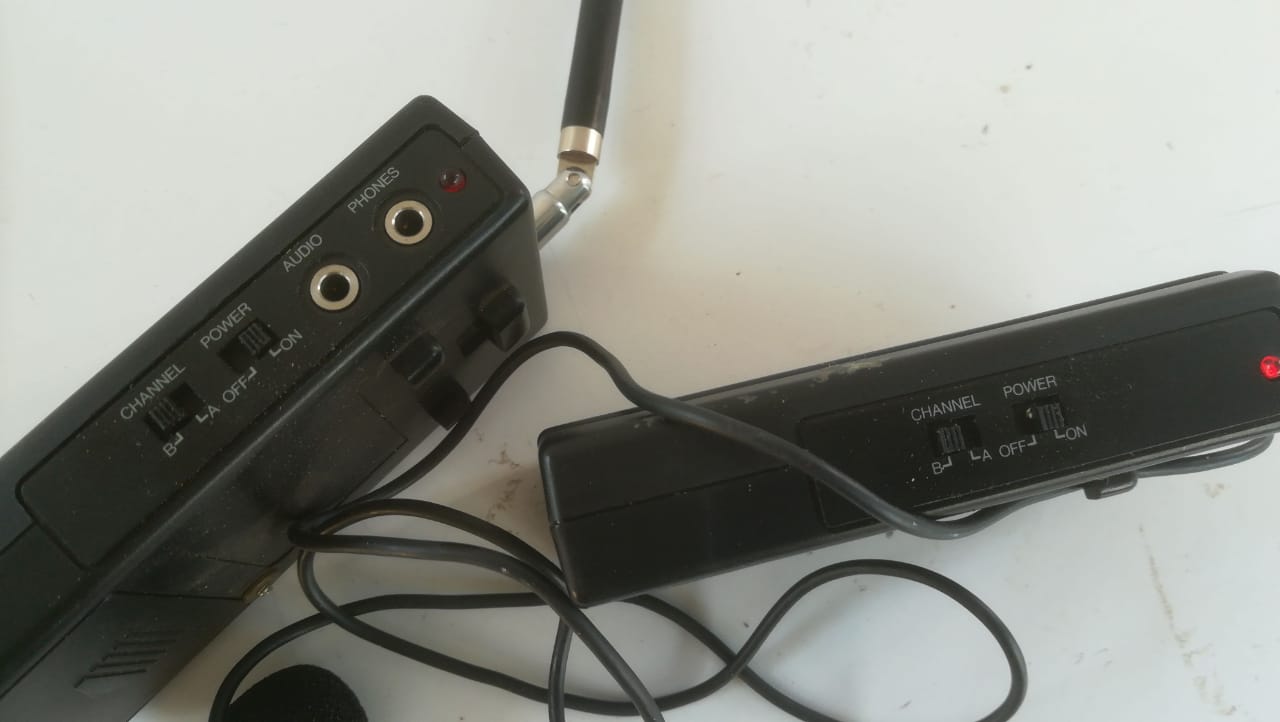 Wireless microphone. Transmitter with condenser mic and receiver unit. 2 Channels. Works well within 5-10m from the base. No cables included. Works with 9v batteries, but battery connectors removed.